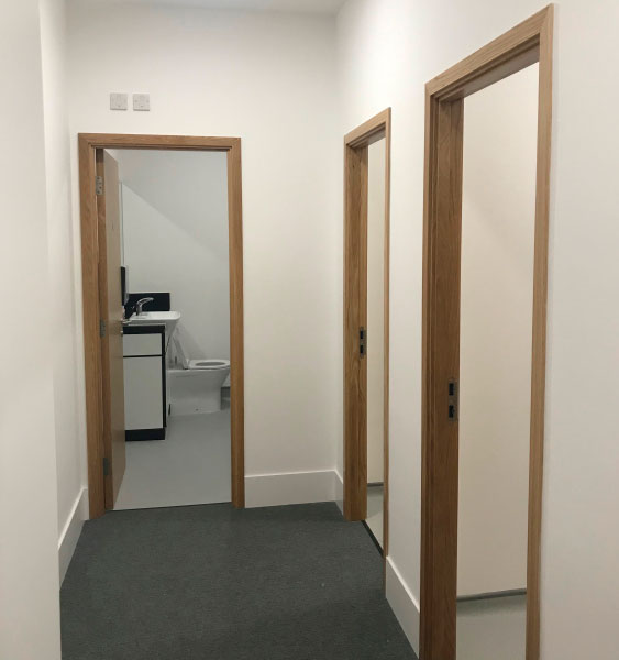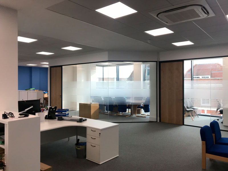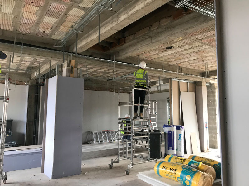 • New plasterboard ceilings with 15mm laying grid with regulated mineral fibre ceiling tiles in the main office and meeting room areas.