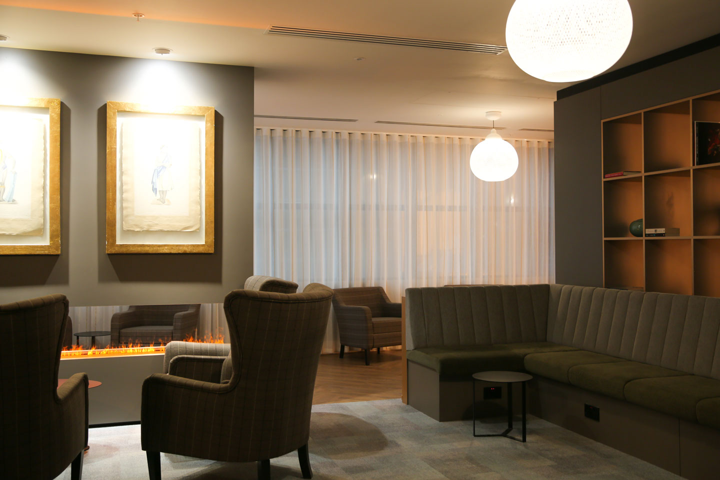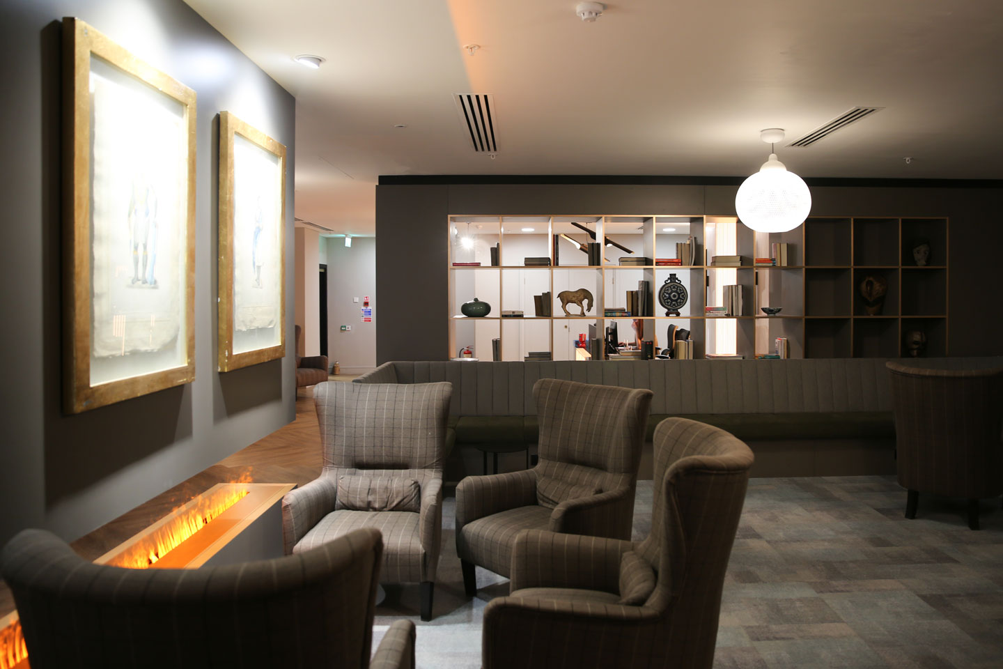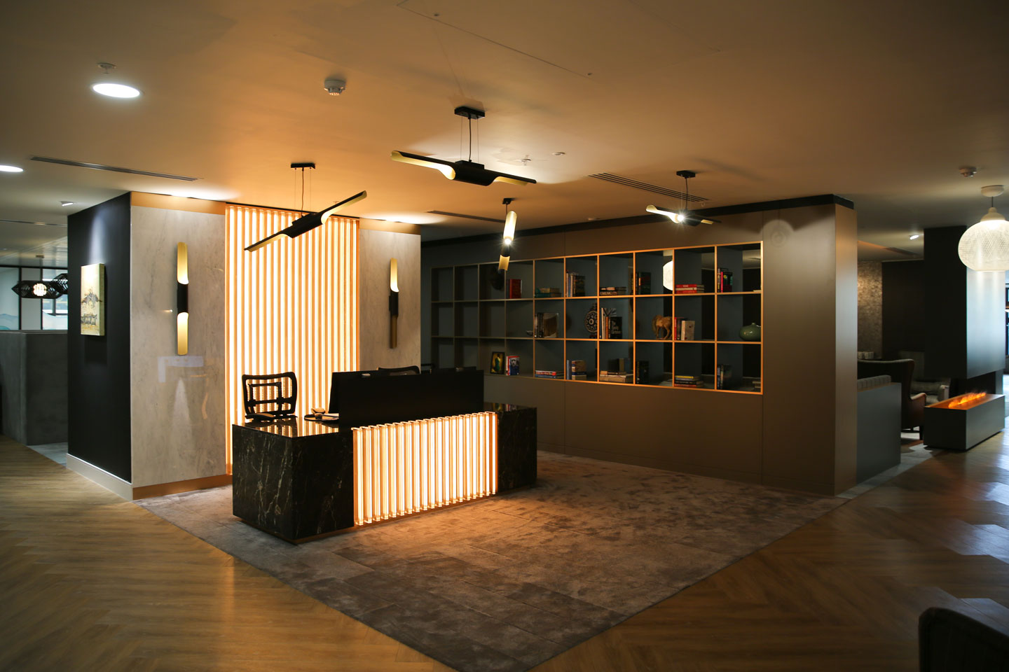 • Relaxing bookcase and fireplace installation on the 8th floor.