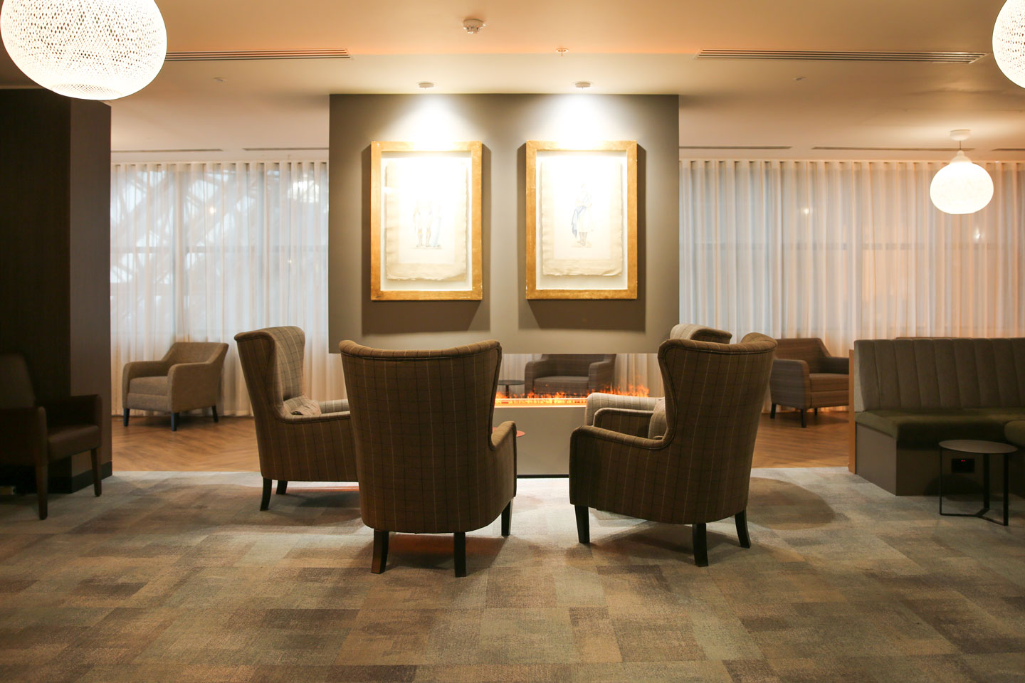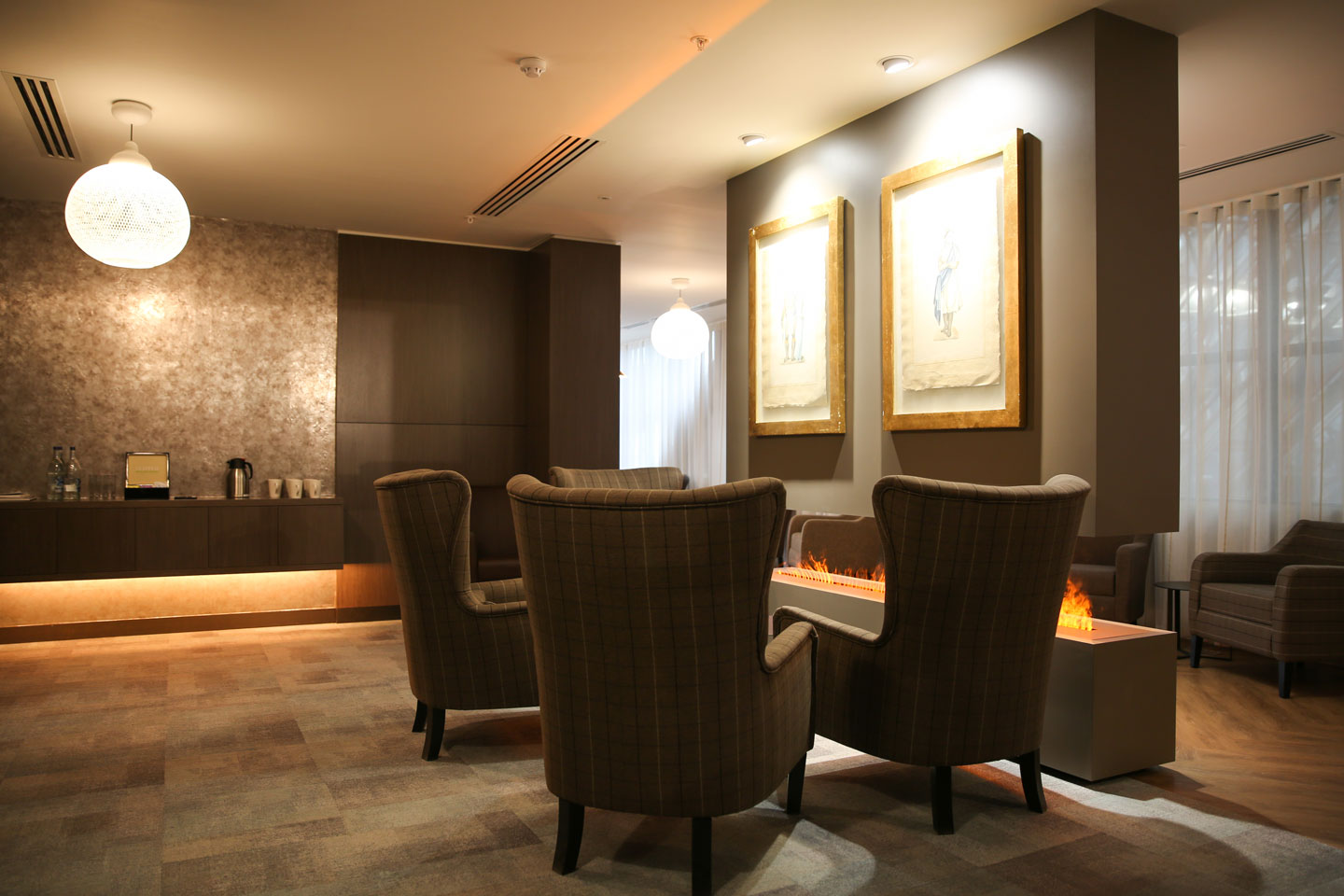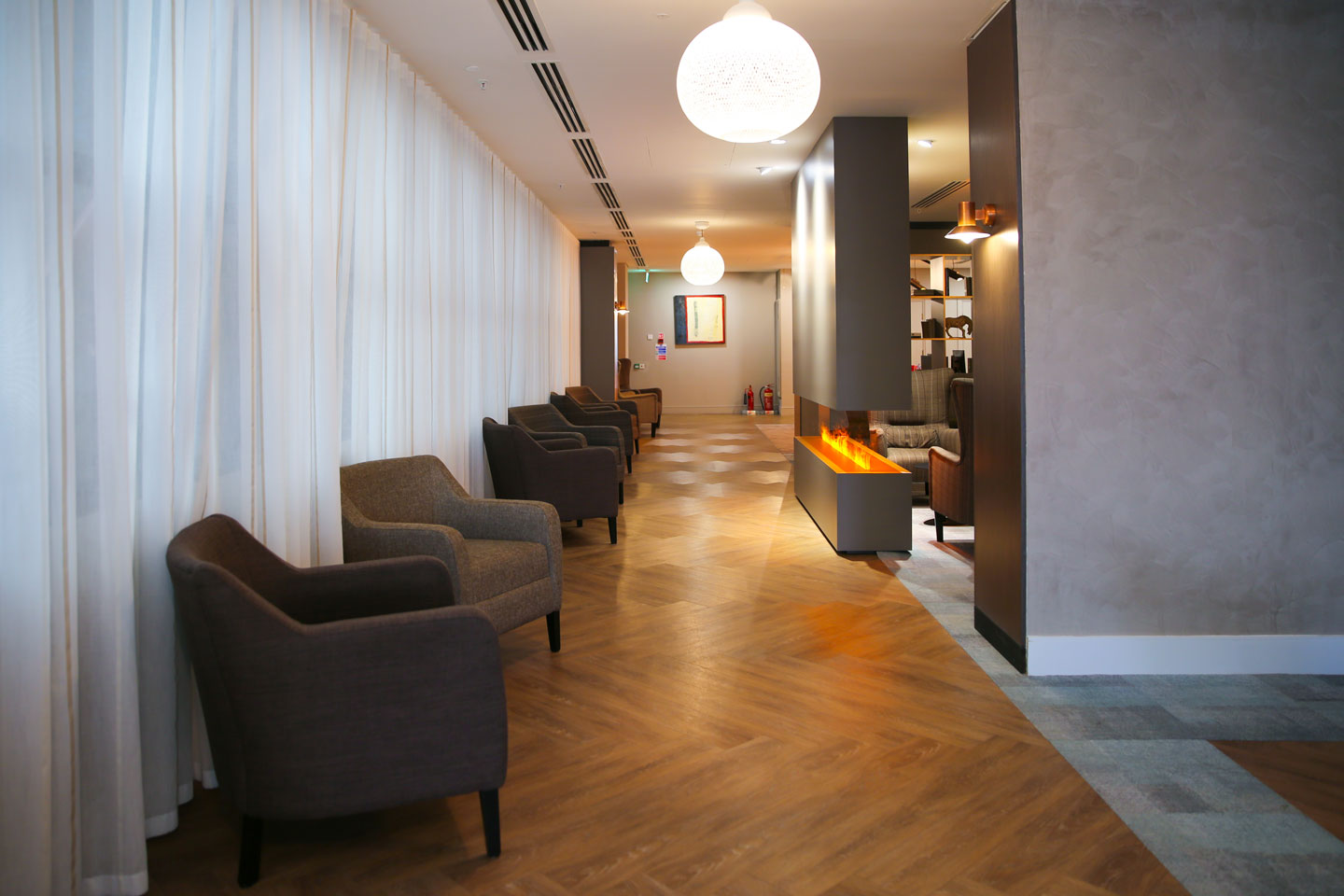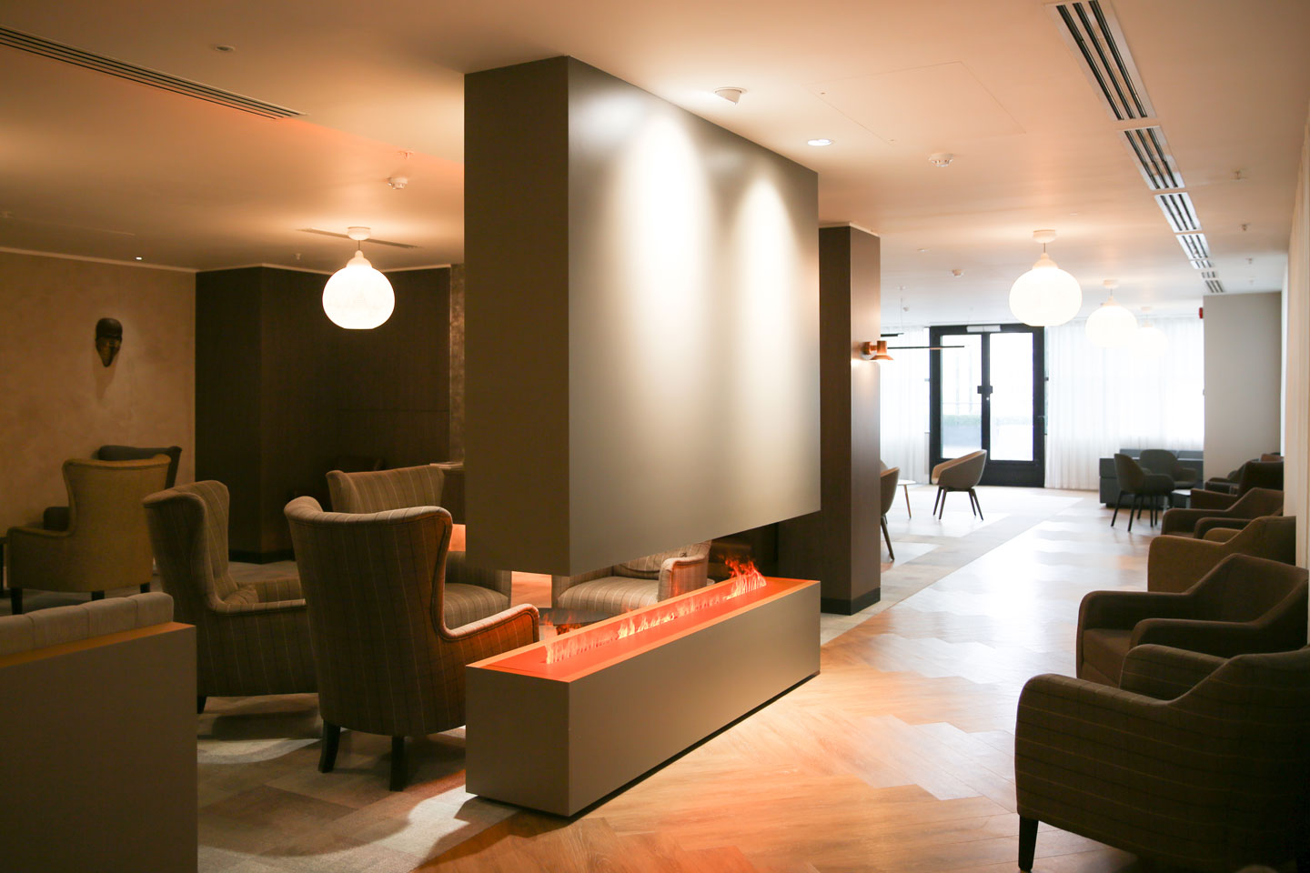 • Relaxing bookcase and fireplace installation on the 8th floor.