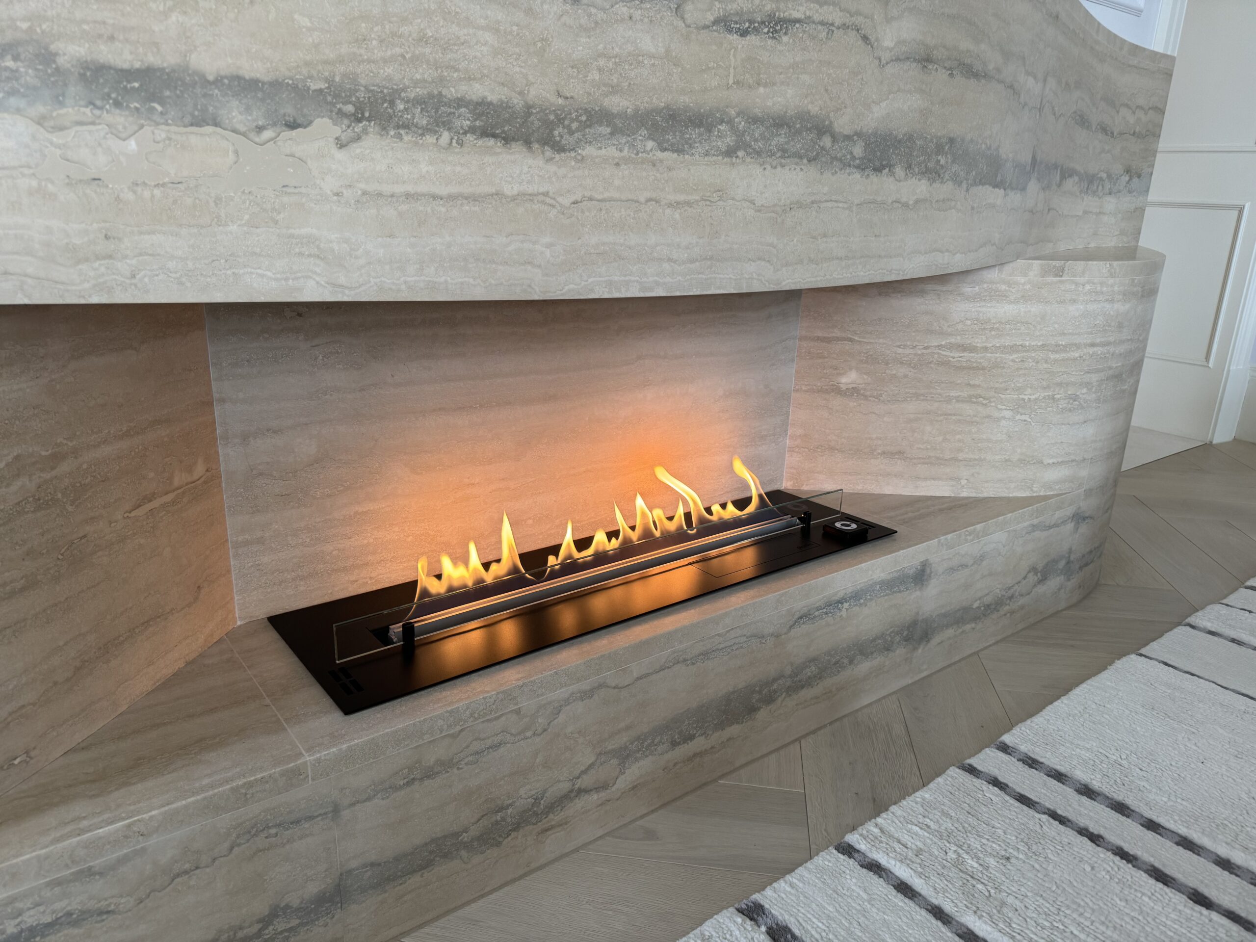 The Bayanix design team personally selected a Travertine block from an Italian stone quarry. This was precision-machined to create a stunning curved stone fireplace as the focal point of the living space.