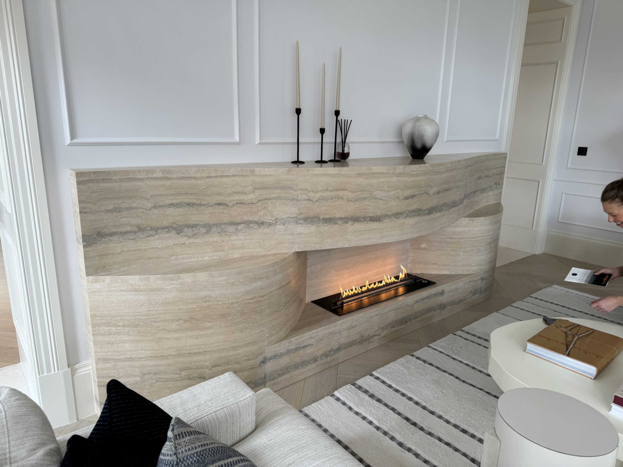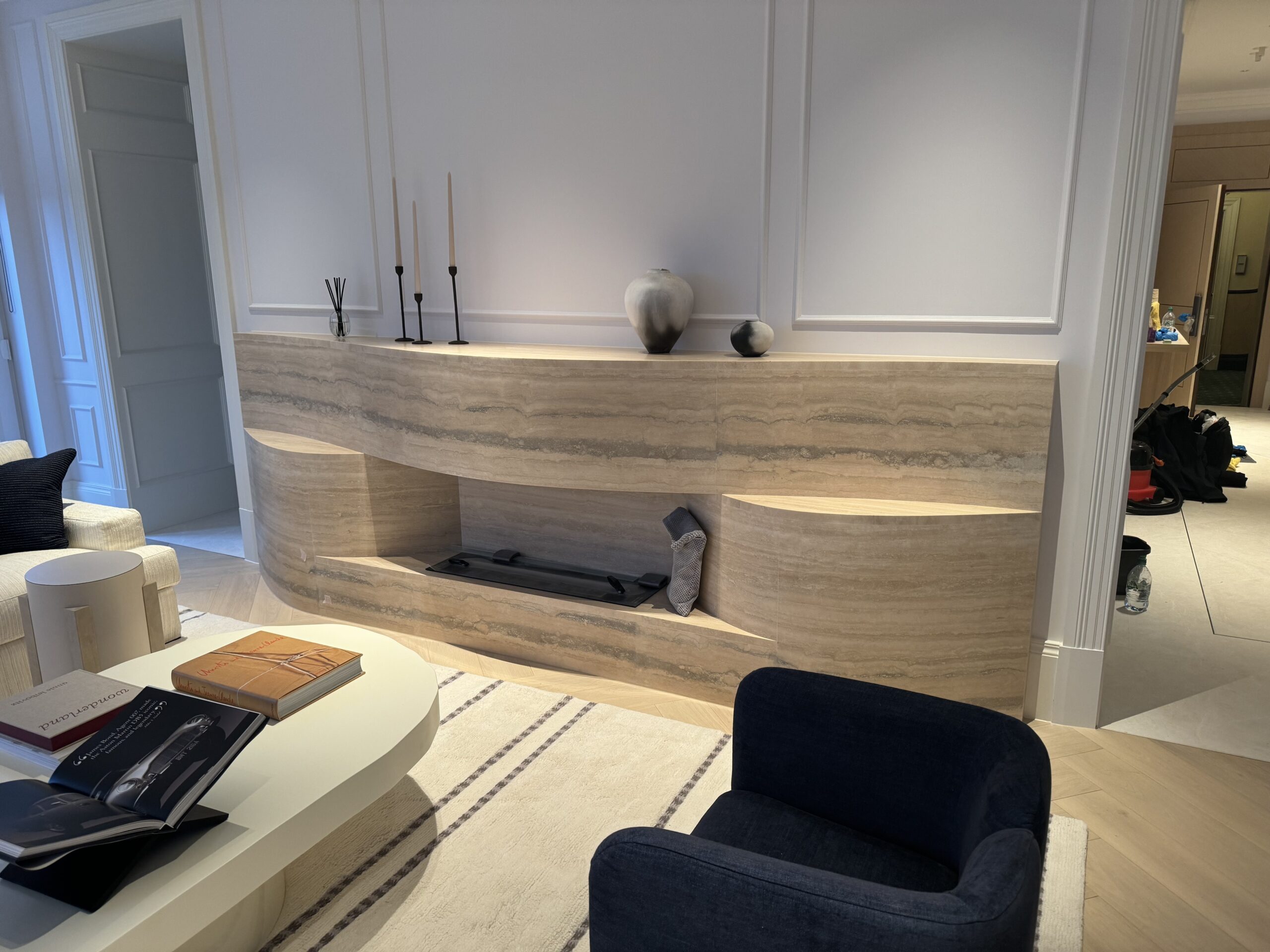 The client’s vision was to create a luxurious London apartment that would showcase bespoke joinery and high-end finishes, including a standout curved stone fireplace and custom stone powder room basin, both of which were to be carved from single blocks of material. Attention to detail and unique design features were paramount to create a high-functioning, elegant living environment.